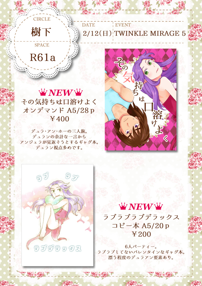7/1 TWINKLE MIRAGE9にて開催される聖剣プチオンリー「ラブマナ」のB:MODEさんのスペース(西1オ23a)にて新刊の無配本と既刊を委託させて頂きます!